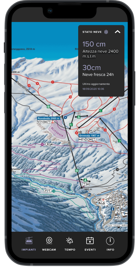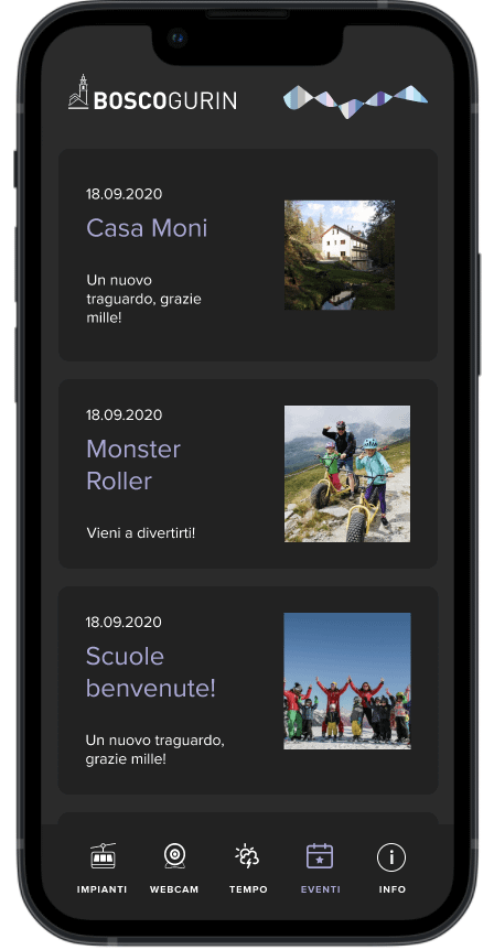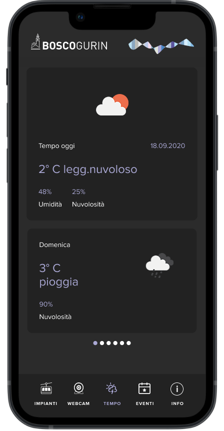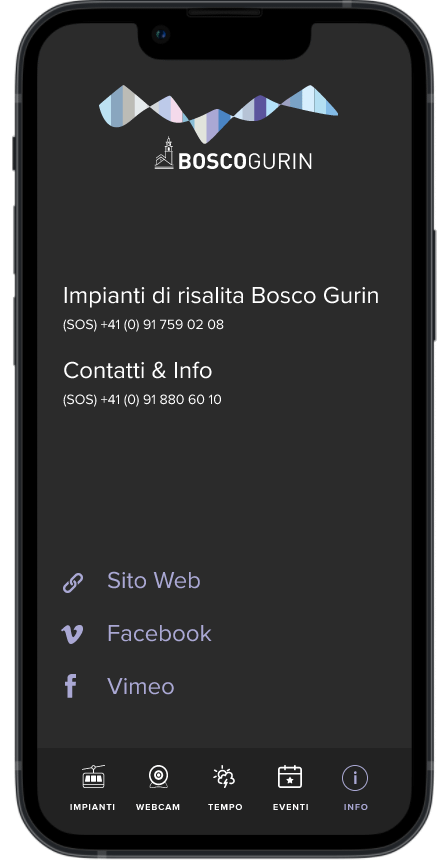 Progettazione di un’app mobile per Bosco Gurin, un piccolo comprensorio sciistico con informazioni su meteo, stato degli impianti, eventi, webcam e contatti utili.