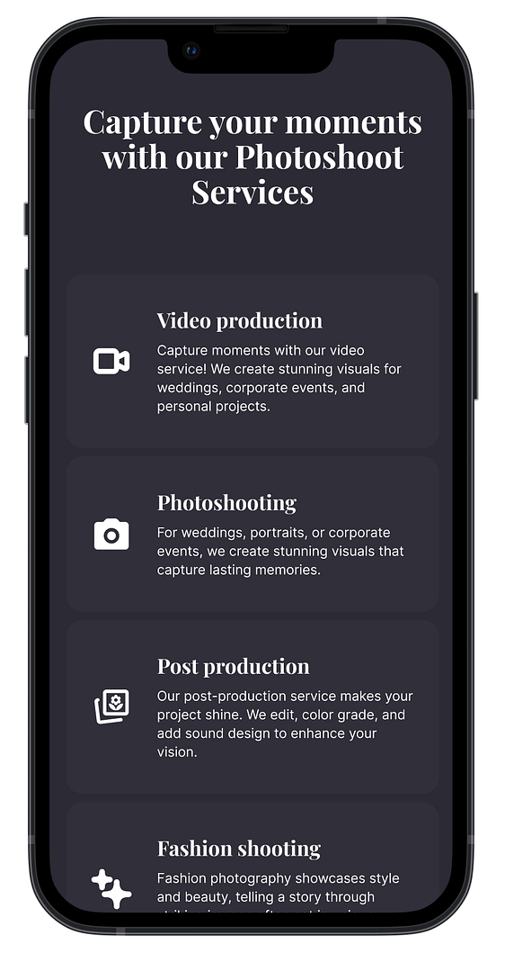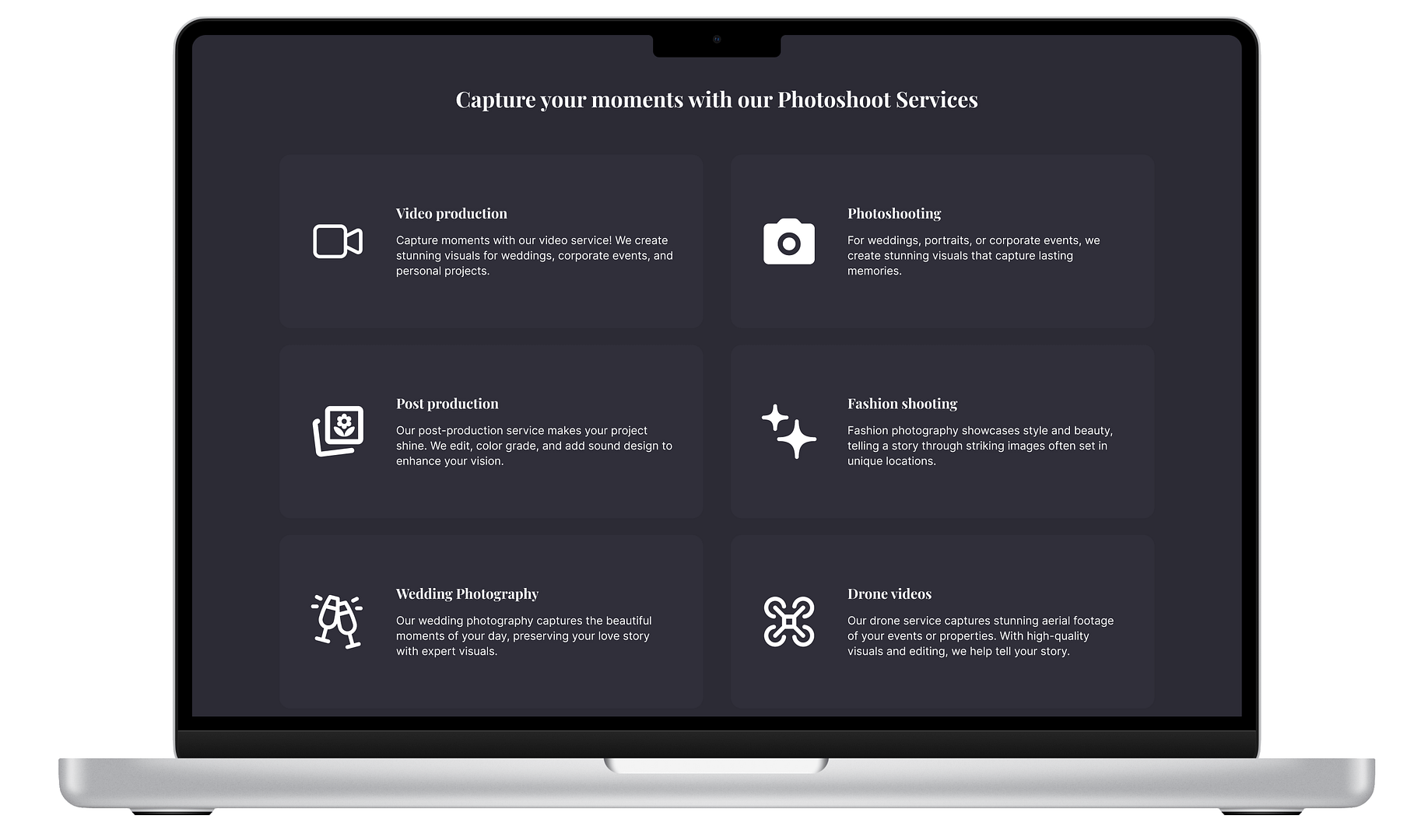 Progettazione di un sito one-page per un’agenzia fotografica e video, con l’obbiettivo di comunicare chiaramente i servizi e rafforzare l’identità del brand.